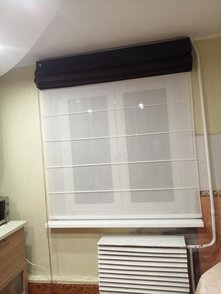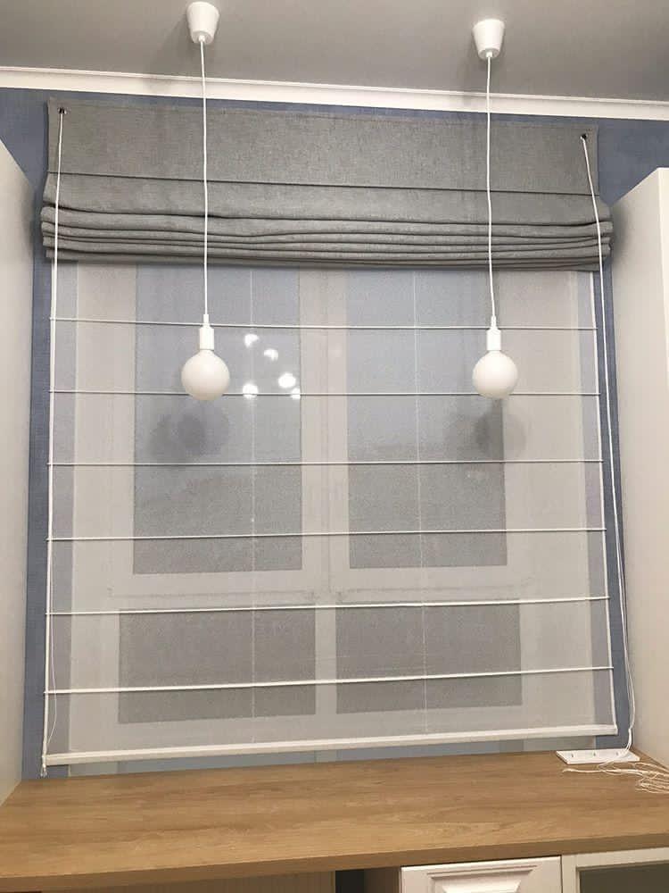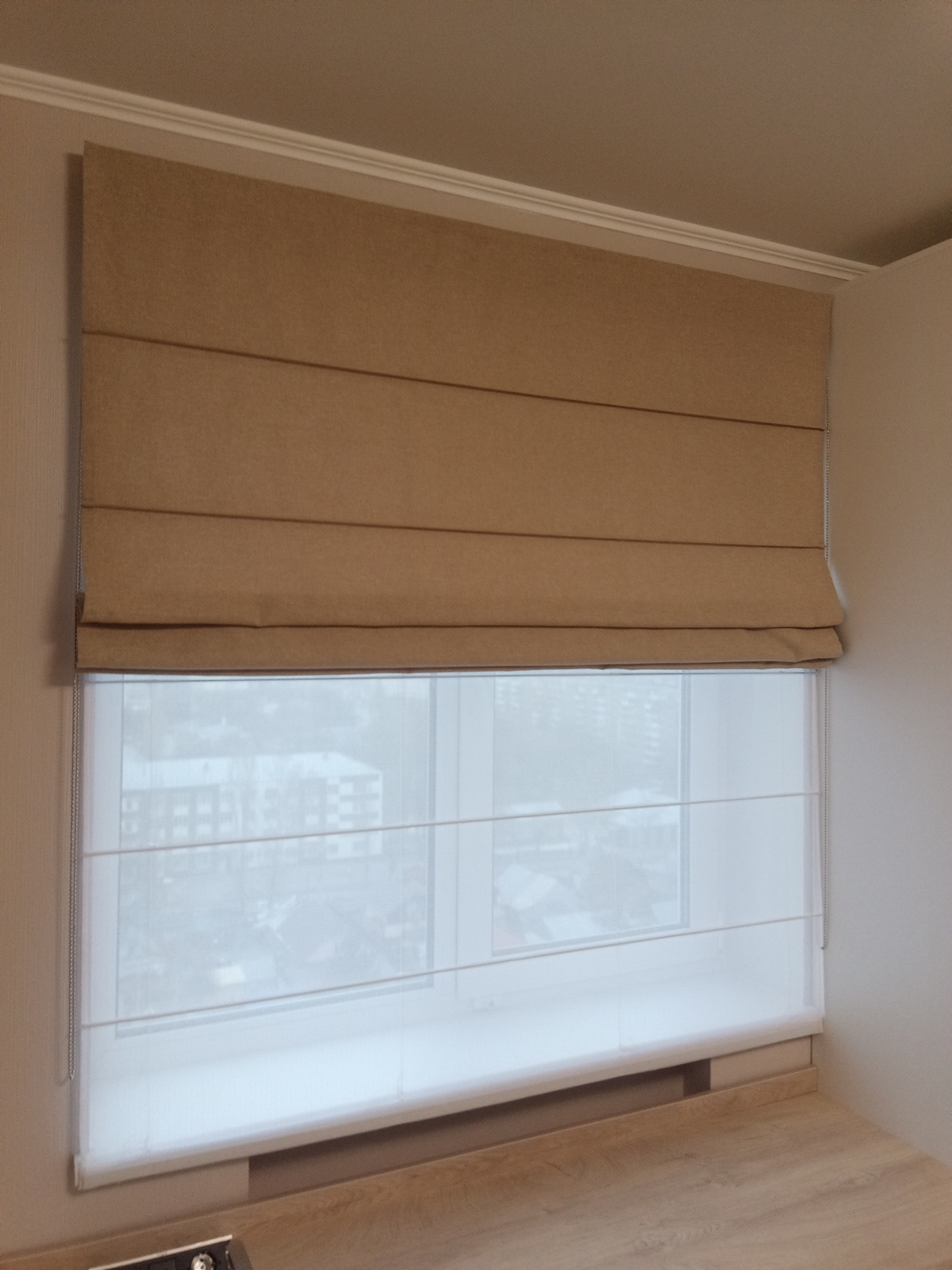 Состоят из двух тканей - основная ткань и тюль, со специальным карнизом с двумя механизмами управления: цепочкой или веревочкой
